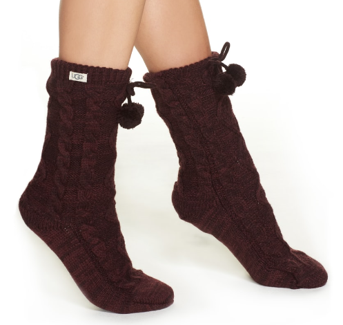 UGG Fleece Lined Socks – $49.50 Chunky cable-knit yarn textures the exterior of these cozy crew socks enhanced by fuzzy pompom ties and plush fleece lining. These come in 4 different colors!